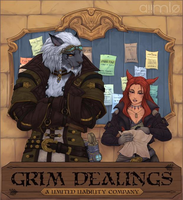 The prodigious duo met while both happened to be tracking the same bounty, each thinking the other was working with their mark. Each hunting the other until the moment they would finally come face to face. The scrappy, Miqo'te held her own, putting a few arrows into the burly Hrothgar but it wasn't until he finally got his hands on her that the two figured out that while they were hunting each other, their mark was getting away and neither of them was actually working with the mark. Hesitant at first, they decided to work together to bring their bounty in and made light work of it, they did. Seeing how well they fit as a team, they worked a few more jobs together before finally coming together under Hafgrim's banner, Grim Dealings.